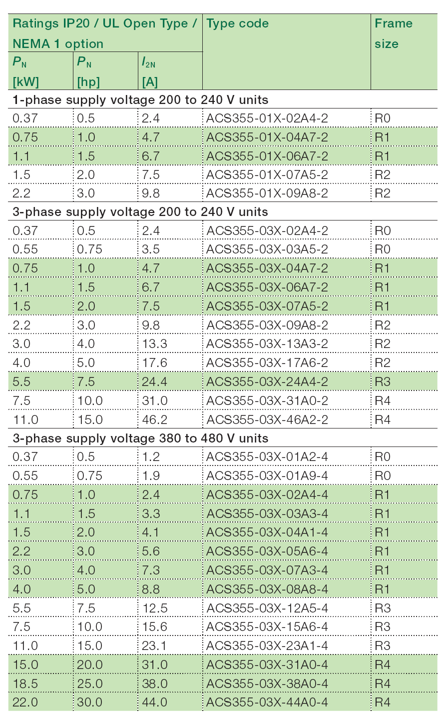 เอบีบี อินเวอเตอร์ รุ่น ACS355 สามารถเลือกได้จากตารางผลิตภัณฑ์