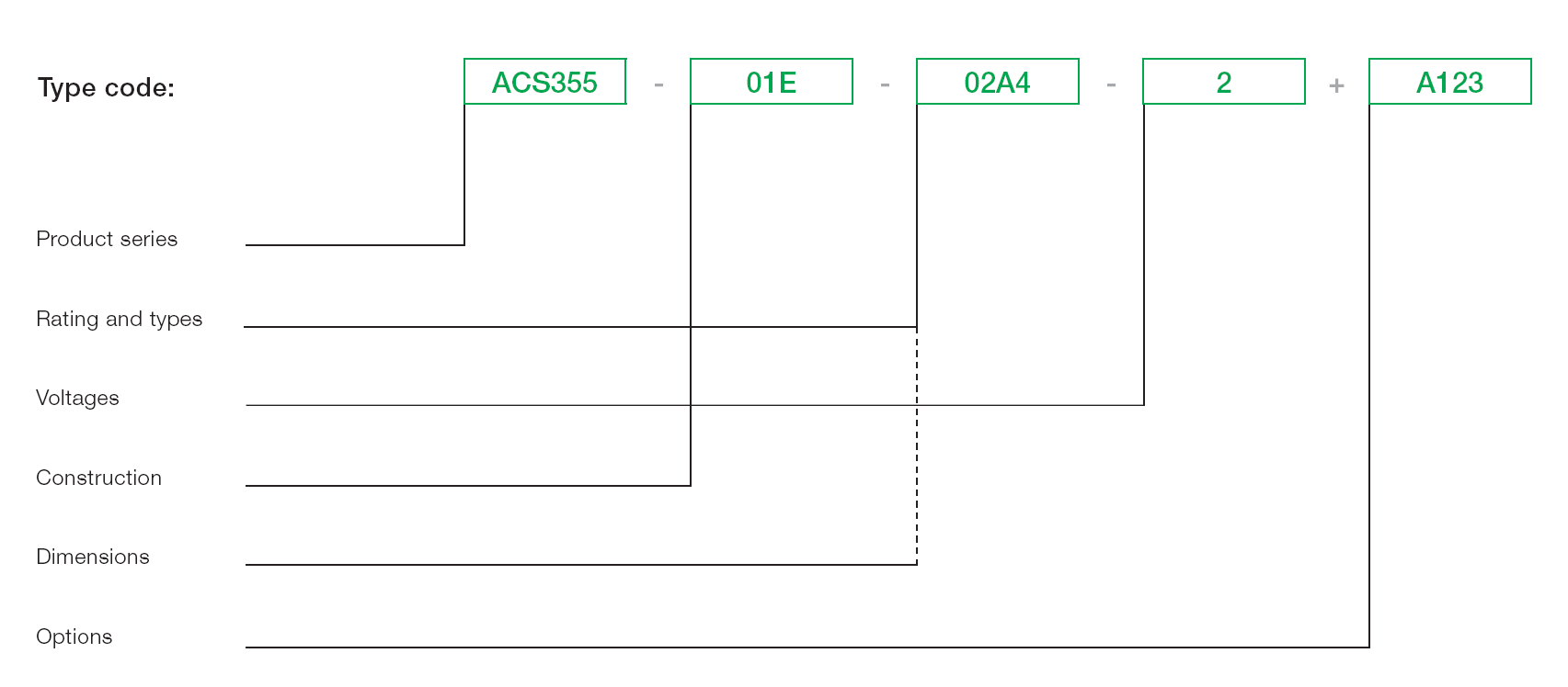 “01E” ใน Type code ข้างต้นหมายถึง อินเวอเตอร์ ACS355รุ่นรองรับไฟแบบ 1 เฟส และมีการต่อ EMC Filterไว้ สำหรับแบบอื่นๆมีดังนี้